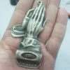 A Christmas tree ornament – Christmas Charm – “Praying Hands” made of zinc alloy metal and plated with Sterling Silver, graded 925. The charm includes Holy Land Soil in a capsule under the Jerusalem inscription.